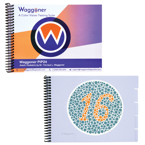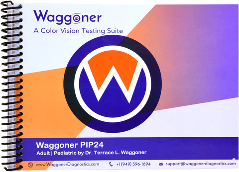 Waggoner PIP24$$$The PIP24 received its name because PIP represents pseudoisochromatic plates, the type of test images used to identify color vision defects, and the fact that the book has 24 plates in total. The PIP24 screens for protan (red weak), deutan (green weak), and tritan (blue/yellow weak) color vision deficient individuals. This test is the perfect choice when testing both adults and children because it has a section to test each demographic. This product is accepted and used by the U.S. Navy, Army, Marines, and Coast Guard.$$$
